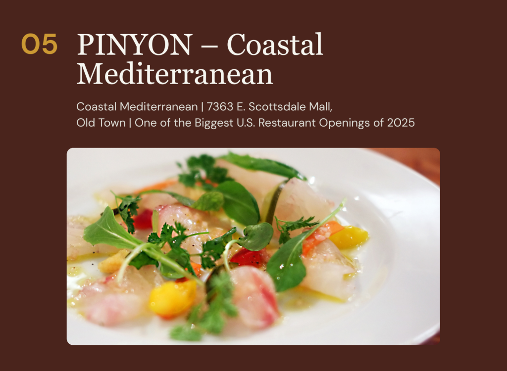 Every few years, a restaurant opens in a city and immediately recalibrates the conversation about what its dining scene is capable of. Pinyon — which opened in Old Town Scottsdale in October 2025 — is that restaurant for Scottsdale right now. The latest concept from Hi Noon Hospitality, the team behind the beloved Valley seafood institution Buck & Rider, Pinyon is the product of a six-week research expedition through the Mediterranean Basin that took founder and CEO Adam Strecker across Spain, Italy, Morocco, Turkey, Malta, France, and beyond. The mission was explicit: to capture not the cuisine of one Mediterranean country, but “the best of the entire Mediterranean basin” — and the result is a restaurant that feels genuinely unlike anything else in Arizona.