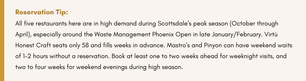 In the short months since opening, Pinyon has become one of the most talked-about restaurants in the Southwest. The combination of exceptional food, one of the most beautiful dining spaces in Old Town, and a concept that feels genuinely fresh and globally ambitious has made it the reservation in Scottsdale for 2026. If you are visiting Old Town and can only add one new restaurant to your list, make it this one.