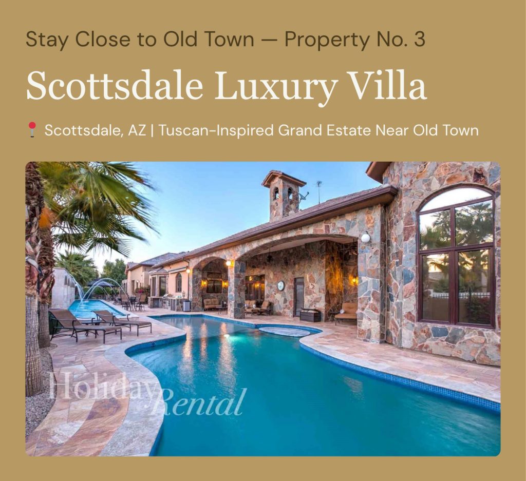 There are estates that feel like luxury accommodations, and then there are estates that feel like the kind of home you could spend a lifetime in. The Scottsdale Luxury Villa belongs firmly in the second category. This magnificent Tuscan-inspired mansion — with its stone-covered exterior, ornate mahogany-and-glass front doors, marble foyer, and a level of interior appointment that one guest compared to stepping into Caesar’s Palace — is the most palatial property HolidayRental.com offers in the Old Town area, and it earns that designation on every possible level.