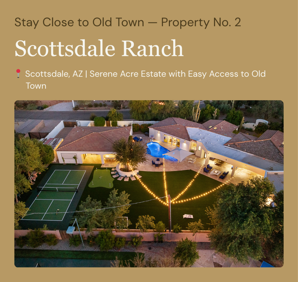 For guests who want the full breadth of the Scottsdale experience — world-class dining in Old Town, desert tranquility at home — the Scottsdale Ranch offers a compelling synthesis. This luxurious ranch estate, spanning over a private acre of manicured grounds, provides the seclusion and sprawl of a genuine Arizona estate while remaining conveniently close to the Old Town dining district and all five restaurants featured in this guide.