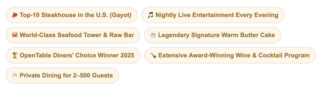 The menu is a steakhouse menu in the classical tradition, executed at a level that justifies every premium. Prime beef — dry-aged ribeyes, bone-in filets, porterhouses built for sharing — anchors a selection that also includes impeccable fresh seafood: jumbo king crab towers, shrimp cocktail served dramatically over dry ice, lobster tails, and a raw bar that would satisfy the most demanding coastal palate. The signature Warm Butter Cake is perhaps the single most-ordered dessert in Scottsdale’s fine dining history, and it earns the devotion — a warm, buttery, caramelized confection that has ruined lesser desserts for generations of diners. Inventive sides like lobster mashed potatoes and gorgonzola mac and cheese demonstrate that even at a classic steakhouse, the kitchen is always thinking beyond convention.