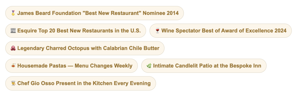 The credentials are extraordinary. Named one of Esquire Magazine’s top 20 Best New Restaurants in the United States in 2013. Nominated by the prestigious James Beard Foundation for Best New Restaurant in 2014. Multiple Wine Spectator Awards of Excellence, including the Best of Award of Excellence in 2024 and Awards of Excellence in 2021, 2022, and 2023. Food writer John Mariani has described Osso as “one of the finest interpreters of modern cuisine in the west.” These are not marketing superlatives — they are the considered verdicts of the American culinary establishment, and they are consistent over more than a decade of distinguished cooking.