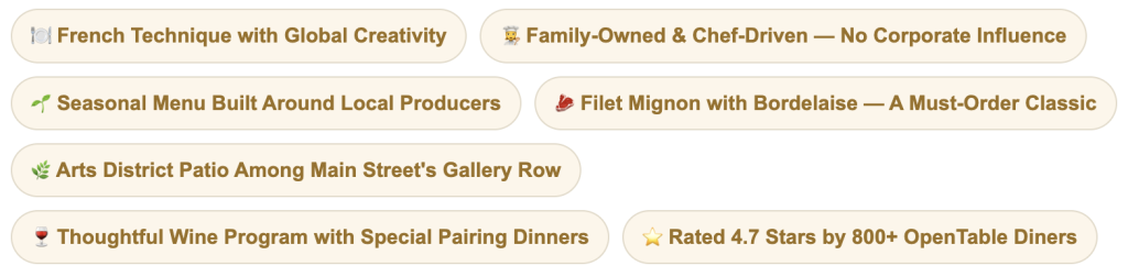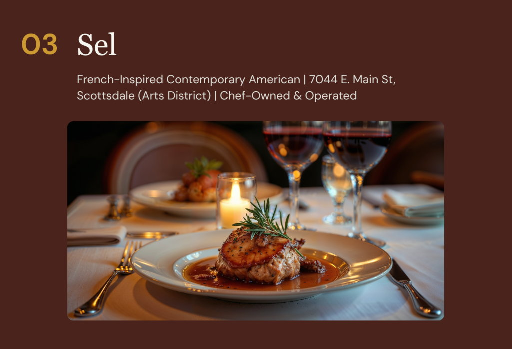 Sel Bistro also hosts special wine dinners — including a recent four-course dinner celebrating the wines of Mexico’s Valle de Guadalupe — that demonstrate the range and ambition of a kitchen that is never content to simply repeat itself. For guests who want a fine dining experience that feels genuinely personal rather than corporate, chef-driven rather than brand-managed, Sel Bistro is the definitive answer in Old Town Scottsdale.
