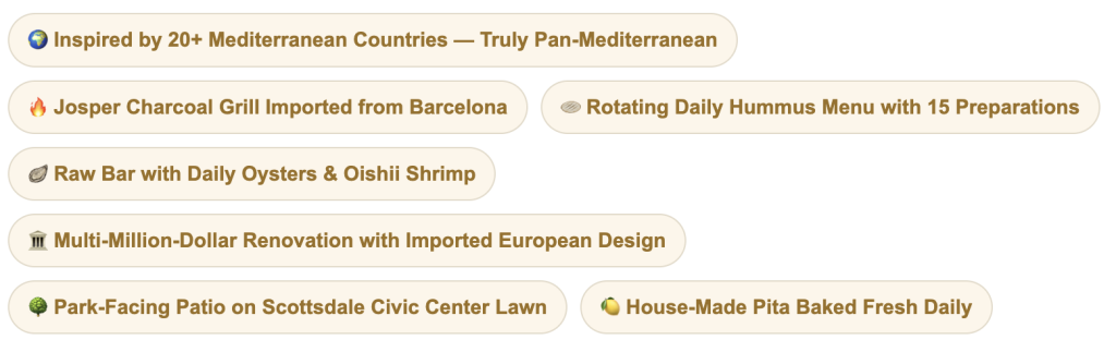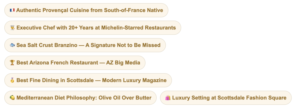 Scottsdale’s culinary reputation has been building for decades, but the last several years have seen Old Town in particular emerge as something genuinely extraordinary. It is a neighborhood where the dining scene has outgrown every expectation visitors arrive with — where the assumption of “upscale Southwest resort food” collides with the reality of weekly-changing prix-fixe menus from chefs with national recognition, French Mediterranean restaurants designed to feel like Provence transported to the desert, and a new wave of Mediterranean restaurant concepts inspired by six-week research expeditions across 22 countries.