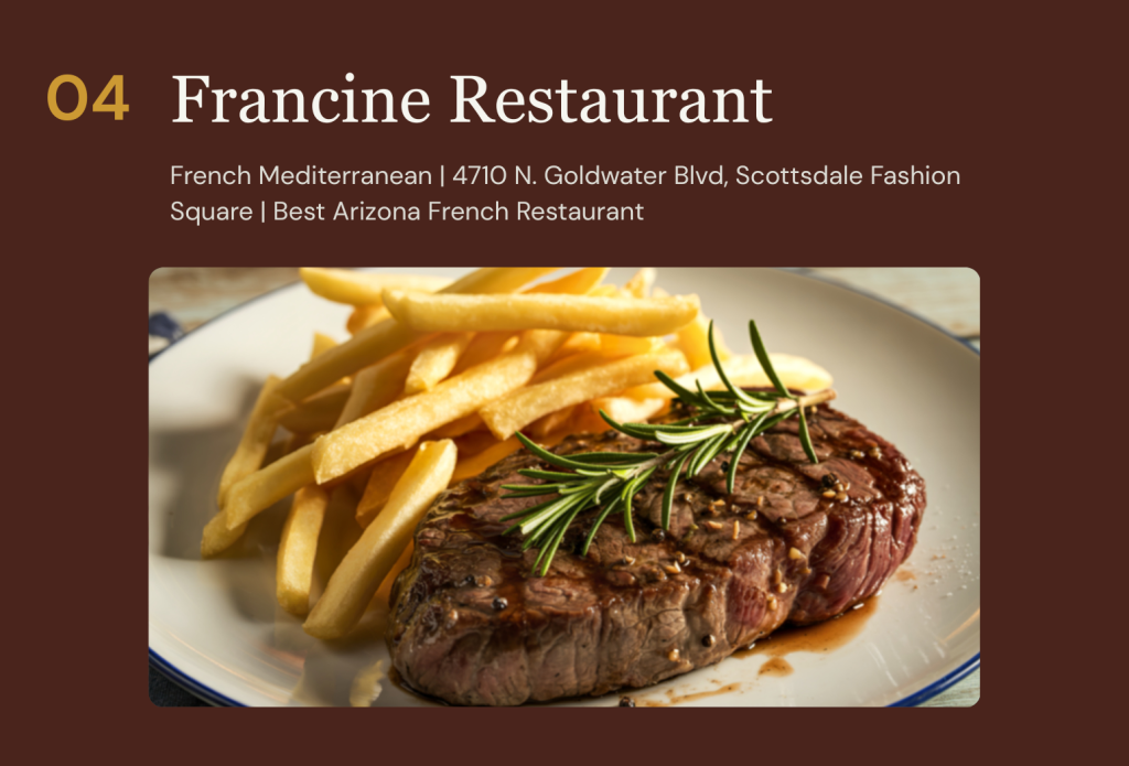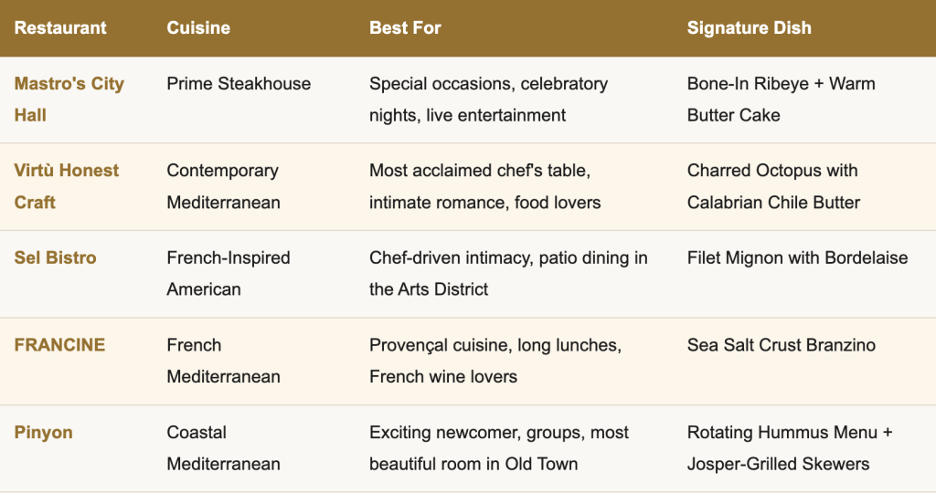 Old Town Scottsdale’s fine dining scene is not a recent discovery or a passing trend — it is the matured expression of a city that has taken food seriously for decades and has recently reached a level of culinary ambition that demands national attention. Mastro’s City Hall has been an institution for more than 20 years. Virtù Honest Craft has been earning its James Beard credentials since 2013. Sel Bistro has been quietly perfecting French-inspired cooking in the Arts District for nearly a decade. FRANCINE has brought the South of France to Scottsdale Fashion Square with unapologetic elegance. And Pinyon arrived in 2025 as the most compelling restaurant opening Arizona has seen in years.
