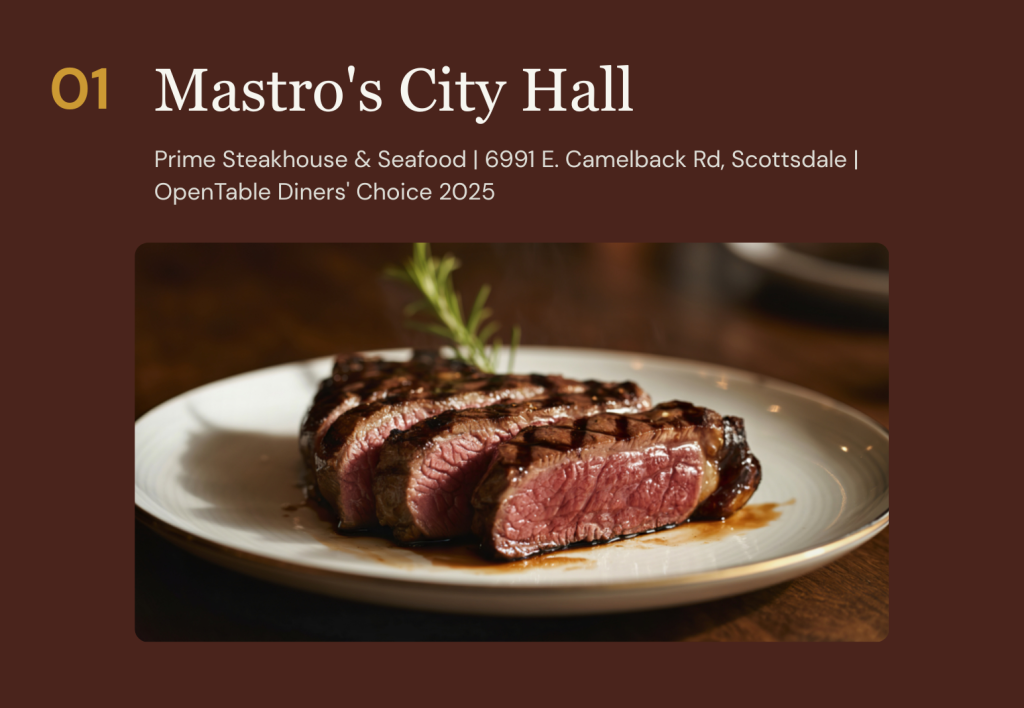 As an OpenTable Diners’ Choice winner for 2025, named one of the top 10 steakhouses in the U.S. by Gayot, and described as the preferred steakhouse of celebrities and discerning locals by multiple publications, Mastro’s City Hall is not a restaurant you visit once. It is a restaurant that becomes part of how you experience Scottsdale.